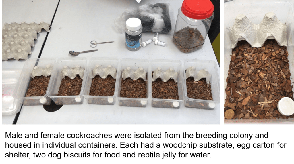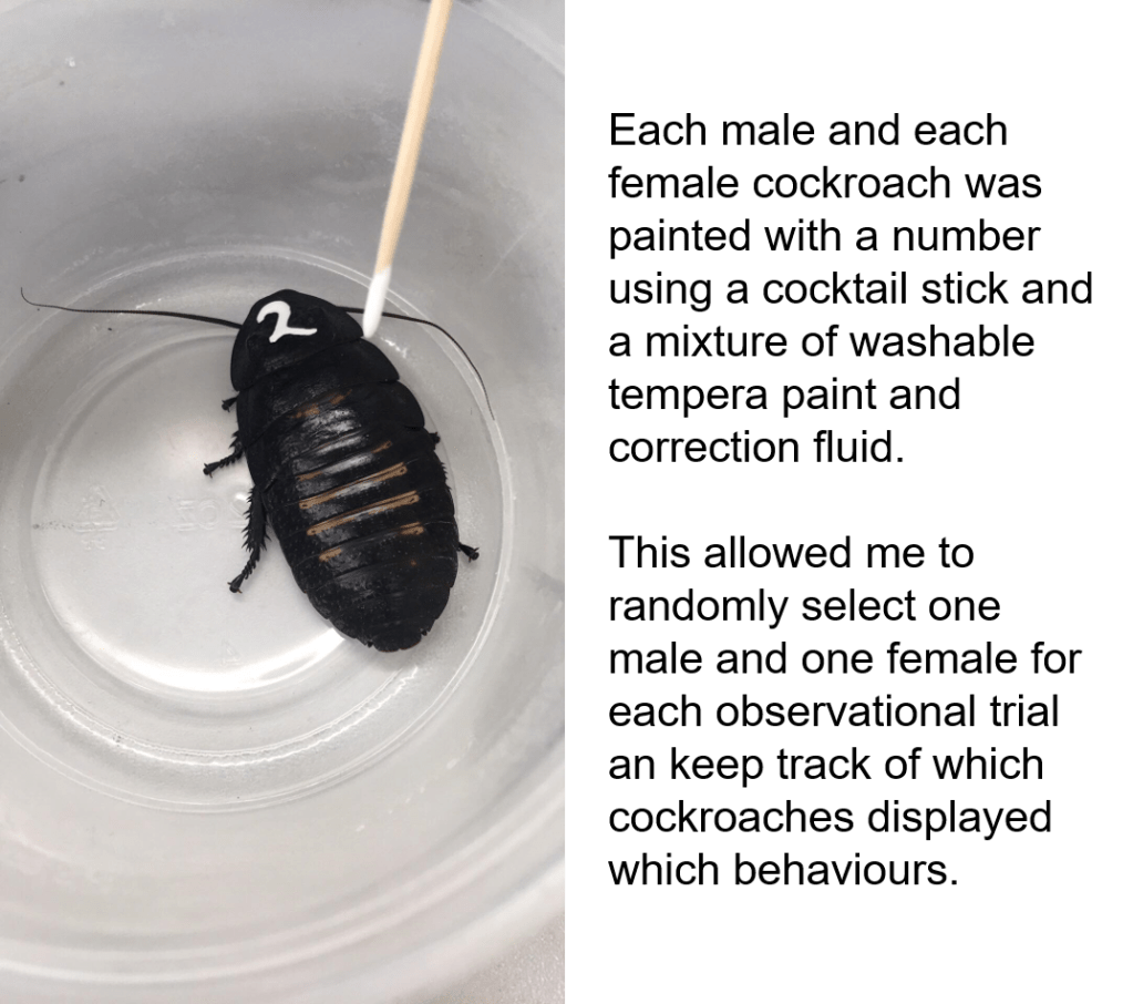There have been a few problems along the way, the biggest of which being that animals don’t always behave how you expect them to. This resulted in days, even weeks of uncertainty about whether I would obtain any valuable data because the cockroaches weren’t interacting much during the observational trials. They do say not to work with children and animals, and I’m starting to understand why. However, this eventually resolved itself and I now have a dataset which I hope will produce some significant results.