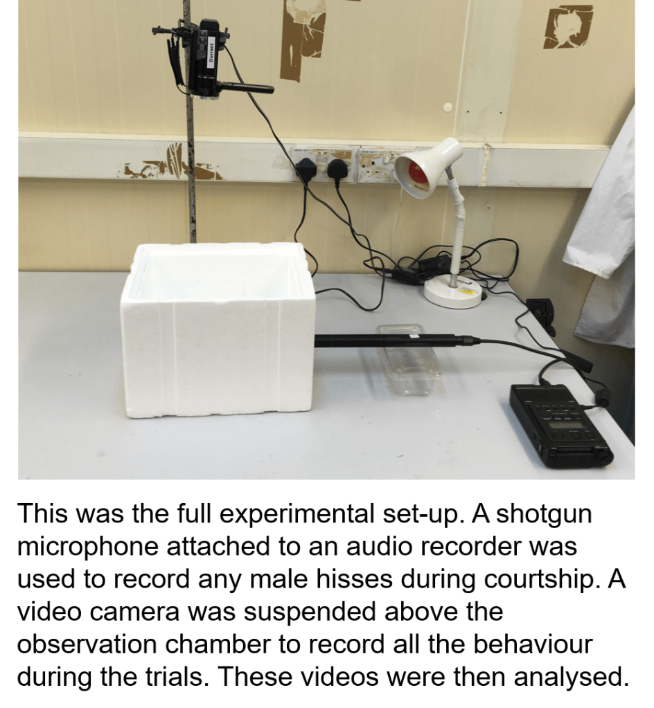 Unfortunately, I cannot now complete part 2 of my research project as a result of the university closure due to COVID-19. This would have involved playback trials in which I would observe female responses to male antagonistic hisses and courtship hisses (chosen at random each time). Using this data, I hoped to determine if females respond differently to the two types of hisses and hence shed more light on the role of hissing within courtship.